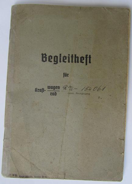 This is a neat - and very unsually encountered! - WH vehicle-ID-paper (ie. booklet) or: 'Begleitheft', as was issued for a: 'Lastkraftwagen Ford (Rum.)' holding the license-plates (or: 'Amtliches Kennzeichen') that reads: 'RU-15461' and that comes in a used but fully complete, filled-in and/or ink-stamped, condition. The neat, soft-covered booklet (measuring: 20,5 x 14,5 cms.) holds all its 40 pages as to be expected. These booklets were the only - and official means! - to identify any WH-vehicle and had to be kept with the vehicle at all times. The neat booklet on offer here was issued in the town of Pilia (I deem in Italy) on 7 July 1944. It most likely belonged to a truck that served within a unit that holded the: 'Feldpostnummer 41398' (as can been seen on the entries and/or ink-stamp as visible on first page of the booklet as can be seen on the photos). According to my references was this 'Feldpostnummer' attributed to a unit named the: 'Kfz.-Instandsetzungs-Park 602' (something that is furthermore elaborated by the ink-stamped entry on page 22 - see photo). The booklet only holds some minimal entries (on regular maintenance and/or technical check-ups) and is for the rest void of entries. It is, however, clearly used and has somewhat yellowed ie. became slightly stained over the years: it furthermore shows some normal wear and/or age. Simply a neat - and most certainly unusually encountered! - vehicle ID-booklet as was issued for a WH-vehicle ie. 'Lastkraftwagen' or truck that would merit further investigative work. This is only the first - and maybe last! - such neat WH-paper-item I have ever encountered!