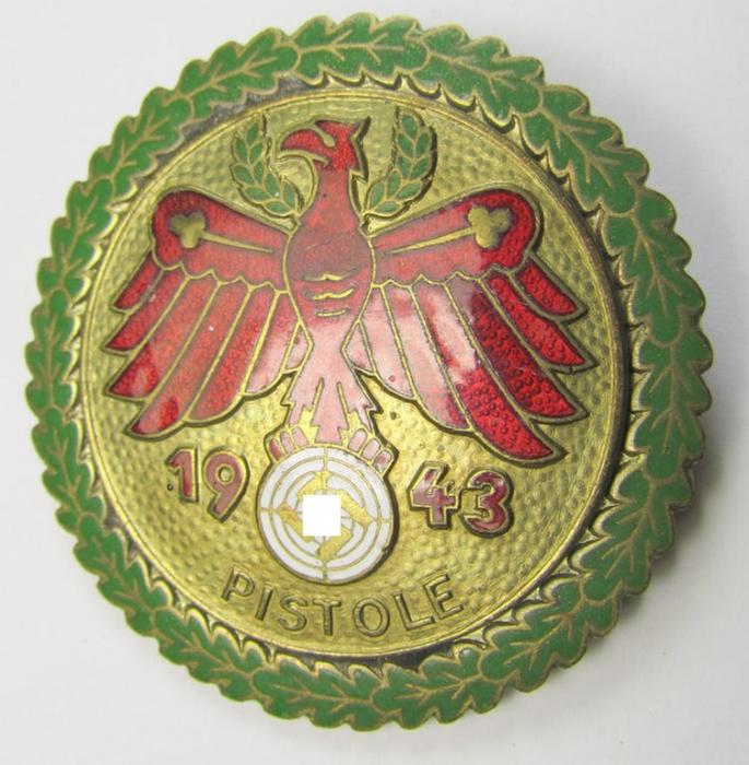 Attractive - and actually not that easily encountered! - so-called: 'Leistungs- abzeichen des Standschützenverband Tirol-Vorarlberg', being a (high-quality-produced-) so-called: 'Gauleistungsabzeichen in Gold für Pistole - 1943'