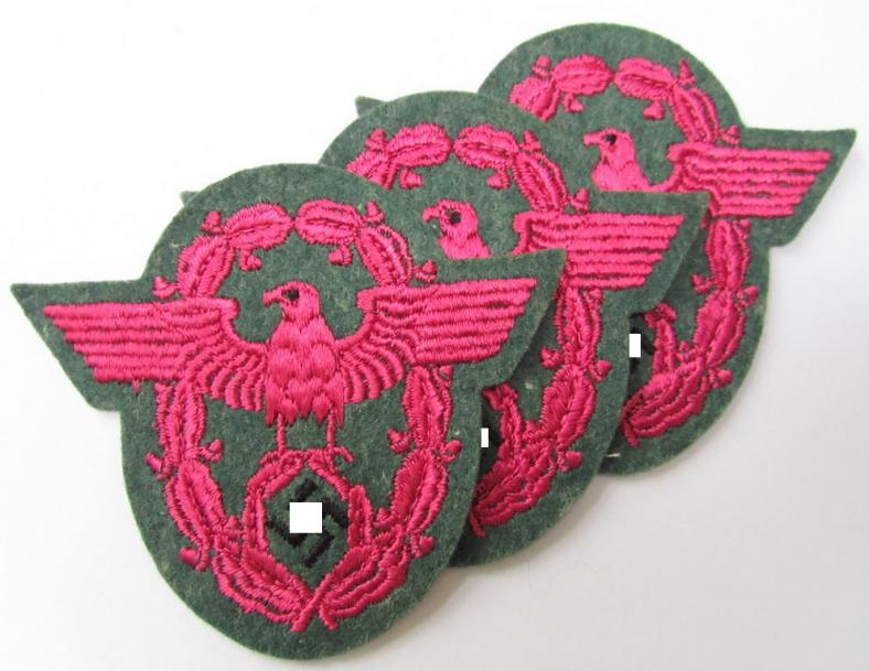I recently uncovered three - fully identical and actually not that easily found! - examples of the police- (ie. 'Polizei'- or: 'Feuerwehr'-) related arm-eagles (ie. 'Ärmeladler') as was intended for usage by the staff of the: 'Feuerlöschpolizei' (or: specific police-related fire-brigades) that all three come in an overall very nice (ie. virtually mint-/unissued- and/or never tunic-attached-), condition. The pieces are executed in bright-pink-coloured linnen and come mounted on a piece of field-grey- (ie. typical 'police-green'-) coloured wool as to be expected (see pictures). These neat arm-eagles were specifically designed for usage by the staff of the: 'Feuerlöschpolizei'-units and saw wide-spread usage throughout the war. The eagles on offer here show great pronounced detail and come in a great (ie. minty and/or never tunic-attached-) condition: they were never worn nor tunic-attached and are void of an additional 'backing' as is more often seen (as can be seen on the pictures). The asking-price is naturally intended for one single arm-eagle. Simply a great occasion to acquire a 'Feuerlöschpolizei'-related 'Ärmeladler' for a competitive price!