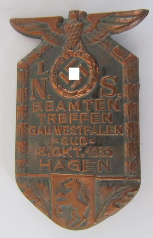Neat, commemorative- and/or copper-based-, bronze-coloured - N.S.D.A.P.-related 'tinnie', being a non-maker-marked example showing the text: 'I. N.S. Beamtentreffen - Gau Westfalen Süd - 8.Oktober 1933 - Hagen'