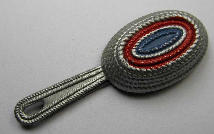 This is an attractive - and not that often seen! - Dutch WWII-period- (ie. NSB or: 'Nationaal Socialistische Beweging' or: Dutch Nazi party-related-), police- (ie. 'Schalkhaar Politie') cap-cocarde (ie. 'Kokarde') as was specifically used on the black-coloured, Dutch-police head-gear (aka: 'Kepi's) and that comes in a virtually mint- (ie. unissued and/or never cap-attached-), condition. The piece - which is executed in silvered, zinc-based metal - shows a red-rimmed- and/or blue-coloured centre and comes mounted on its specific mounting set-up (as can be seen on the pictures). The piece is totally void of any marking. Simply a neat - and not that often seen! - Dutch WWII-period cap-cocarde that was intended for usage by the 'Schalkhaar Politie'!