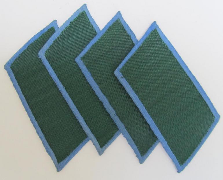 I recently found four - fully indentical albeit regrettably single but nevertheless still scarcely encountered! - examples of the 'BeVo'-woven- and blue-piped 'Ostvölker'-collar-tab, as was specifically intended for usage by a Turkistanian volunteer who served within the 'Deutsche Wehrmacht' ie. 'Schütze' within the 'Turkistanianisches Legion'. All four tabs come in a very nice (ie. virtually mint- ie. unissued-), condition and were never used nor tunic-attached. The tabs are nicely executed in the so-called: 'BeVo-weave technique' as can be seen on the pictures and are impossible to upgrade: the pieces were never trimmed but come in a prefolded-condition. It should be noted that these - original - 'official' collar-tabs executed in 'BeVo'-type weave (ie. German manufacture by the company of 'BeVo') are considered 'fairly scarce'. My asking-price is naturally intended per single piece. Simply a nice opportunity to acquire a German-made 'BeVo'-cloth collar-patch as was intended for usage by a foreign volunteer who served within the 'Deutsche Wehrmacht': too bad that it is only a single example!