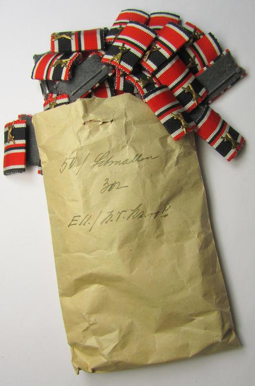 I recently uncovered a small hoard comprising of various 'Band- o. Feldspangen' that all originated from a larger hoard (ie. 'Herstellerbestand') holding various, virtually 'mint- ie. unissued' pieces that were never worn and were simply 'left-over' after the war. The pieces on offer here are attractive, 2-pieced-, WWII-period, WH (Heeres. Luftwaffe, Kriegsmarine etc.) medal-bars (ie. 'Band- o. Feldspangen') that respectively depict the ribbons for repectively an: 'Eisernes Kreuz II. Klasse' (or: iron cross second-class) and a: 'Kriegsverdienst Kreuz II. Klasse mit Schwerter' (or: war-merits cross 2nd. class with swords) still having their golden-coloured swords-devices attached. Both ribbons are of the regular (ie. smaller-), ribbon-bar-size and measure approximately 1,5 cms. each as is more often encountered (the pieces have a total length of approximately 3 cms.). All 'Spangen' are neatly 'backed' with field-grey-coloured (as can be seen on the pictures). The attached devices show some minimal age ie. tarnish but have on all pieces been nicely preserved. The (identical) pieces show some usage-marks and/or minimal aging simply caused by decades of storage only: they came still 'packed' in their period storage-enveloppe that shows the inked text: '50 Schnallen - 302 EK./K.v.Kreuz X1' (or alike). The asking-price is naturally intended per single piece. Simply a great occasion to acquire an attractive 2-pieced 'Band- o. Feldspange': great to decorate or to 'promote' almost any tunic!