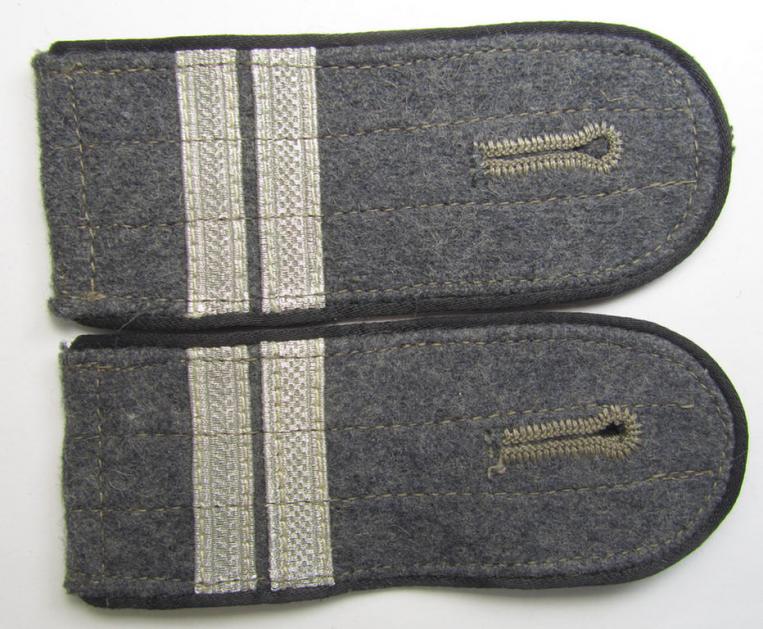The attractive pair is 'off-factory' constructed from a 'standard'-pattern pair of 'regular'- (ie. fully 'text-book'-) so-called 'simplified' (ie. 'M44-type'-) WH (Luftwaffe) 'Pioniere- o. Bautruppen' (ie. engineers) shoulderstraps having the black- (ie. 'schwarzer'-) coloured- and/or 'silk-like'-type piping, attached. The neat straps show a 'double stripe' of silver-coloured- (regular LW-type) NCO-braid 'off-factory'-attached in a horizontal manner (almost certainly signifying an NCO-rank) although this could not be fully ascertained. The straps - which measure 9,5 cms. in length each as more often - come in a 'virtually mint- ie. unissued' condition and were almost certainly intended for usage by one of the foreign volunteer- ie. 'Ostvölker'-regiments. To date the exact usage or signifigance could not be identified yet. These neat pairs of 'Ostvölker'-related shoulderstraps can easily be graded 'very scarce'. I deem that this interesting shoulderstrap-pair is accordingly priced!