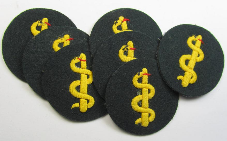 I recently found a small bundle holding 7 fully identical patches being all neatly hand-embroidered examples which are all executed in bright-yellow- (ie. red and/or black-) coloured linnen on a dark-green-coloured- (and/or smooth woolen-based-) background. All examples are nicely maker- (ie. 'G &H'-) marked on the (neatly reinforced!) backings and all show some minor age ie. minimal staining caused by decades of storage only (see pictures). The pieces have simply never been used and can easily be graded 'mint-/unissued'. As stated above do all 7 insignia-pieces show an additional- ie. 'double'- backing as executed in greyish-blue-coloured linnen. The price is naturally intended per single piece. I deem that these neat items are fairly priced!