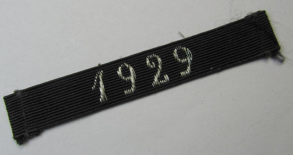 This is a neat - and actually fairly unusually encountered! - so-called: 'N.S.D.A.P.-Verdienst-Abzeichen' being an example as was intended for the year: '1929' and that comes in an overall very nice- (albeit I deem only slightly worn- ie. tunic-removed-), condition. These small (ie. 7 x 1 cms.-) sized black-coloured- and/or linnen-based 'stripes' depict the year of entry within the 'N.S.D.A.P.-party and were worn on the upper-left arm (above the 'Armbinde') on the various N.S.D.A.P. uniforms and/or tunics. The year-nomination is nicely machine-stitched in silver-coloured so-called: 'flat-wire'-technique (as can be seen on the pictures). The neat piece shows some minimal staining ie. discolouration caused by normal wear ie. storage (nothing shocking though). Simply an attractive - and actually unusually encountered (early!) 'N.S.D.A.P.'-related cloth-insignia-piece that is accordingly priced!