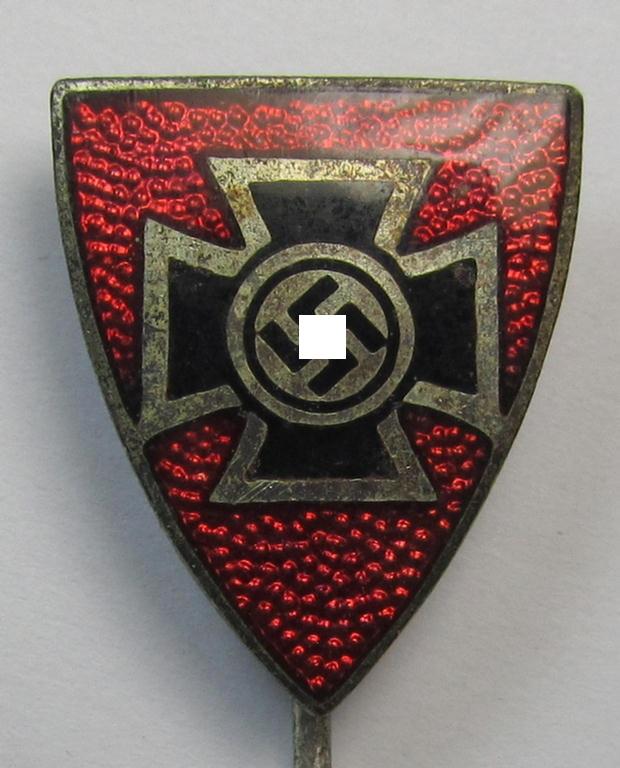 This is an attractive multi-coloured- and/or: nicely enamelled, membership-lapel-pin (ie. 'Mitgliedsabzeichen') as was intended to signify membership within the: 'Nationalsocialistischer Reichskriegerbund' (ie. 'N.S.R.K.B.') being a non-maker-marked example that bears a: 'Ges.Gesch.'-patent-pending-designation on its back and that comes in an overall very nice- (albeit moderately used ie. worn-), condition. The lapel-pin shows some minimal wear and/or age (mainly dirt and/or minimal staining but has truly no enamel damage whatsoever - as can be seen on the pictures). A similar pin - which comes mounted onto its functional pin - is also figured in the Heering-Hüsken lapel-pin catalogue, wherein it is given a unique reference-number (9653A).Simply an attractive TR-lapel-pin that is with certainty accordingly priced!