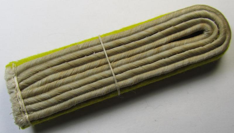 This is an attractive - and/or fully matching! - pair of WH (Heeres) officers'-type shoulderboards as was piped in the neat bright-yellow- (ie. 'zitronengelbener'-) coloured branchcolour as was specifically intended for a: 'Leutnant eines Nachrichten-Abteilung o. Regiments' (or: lieutnant who served within an army signals regiment or unit) and that comes in an overall very nice- (ie. never worn- nor used- ie. 'virtually mint'-), condition. The shoulderboards are 'text-book'-examples of the 'Heeres'-type, 'Nachrichten'-shoulderboards and have the silver- (ie. yellowish-golden- and somewhat 'sub-dued'-) 'upperdecks'. The boards show the desirable bright-yellow- (ie. 'zitronengelbener'-) coloured branchcolour (and were constructed from the 'smooth-type' wool as to be expected). The boards never had any tongues attached and were with certainty a pair that was intended to be used as a pair of the 'sew-in'-pattern: they come still 'tied-together' as issued (as can be seen on the pictures). The boards measure approximately 11,2 cms. in length each as more often. The pair - which never had any 'cyphers' nor pips attached - does show some minimal age and/or staining simply caused by years of storage only. Simply an attractive shoulderboard-pair that belonged to a: 'Leutnant eines Nachrichten-Abteilung o. Regiments' and that is impossible to be upgraded!