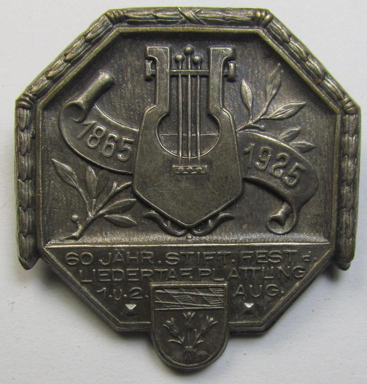 The commemorative day-badge (ie. 'tinnie' or: 'Veranstaltungsabzeichen') is executed in (minimally tarnished) silver-toned (and I deem) zinc-based metal and depicts an illustration of a lyra coupled with the dates 1865 - 1925 and text that reads: '60 Jähr. Stift.Fest d. Liedertaf. Plattling - 1. u. 2. Aug.' and was as such (presumably) intended- ie. issued for a: 'DSB'- (ie. 'Deutsche Sänger Bund'-) related gathering, held in the year 1925. The badge - that shows some normal wear and/or moderate age - is void of a makers'-designation and comes naturally mounted onto its functional pin-/catch set-up and has I deem never been cleaned nor polished: it shows some minimal age ie. staining (as can be seen on the pictures) but is still very detailed and/or pronounced (as can be seen on the pictures). I am convinced that this is an unusally encountered 'DSB'- (ie. 'Deutsche Sänger Bund'-) related 'tinnie' that is with certainty accordingly priced!