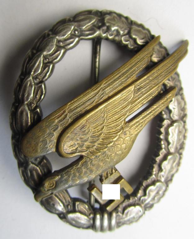 Superb - and early-war-period! - tombak- (ie. 'Buntmetall'-) based specimen of a WH (LW) 'Fallschirmschützen-Abzeichen' (being a maker- ie. 'A'-marked, 'Type E'-pattern example) by the 'Assmann'-company