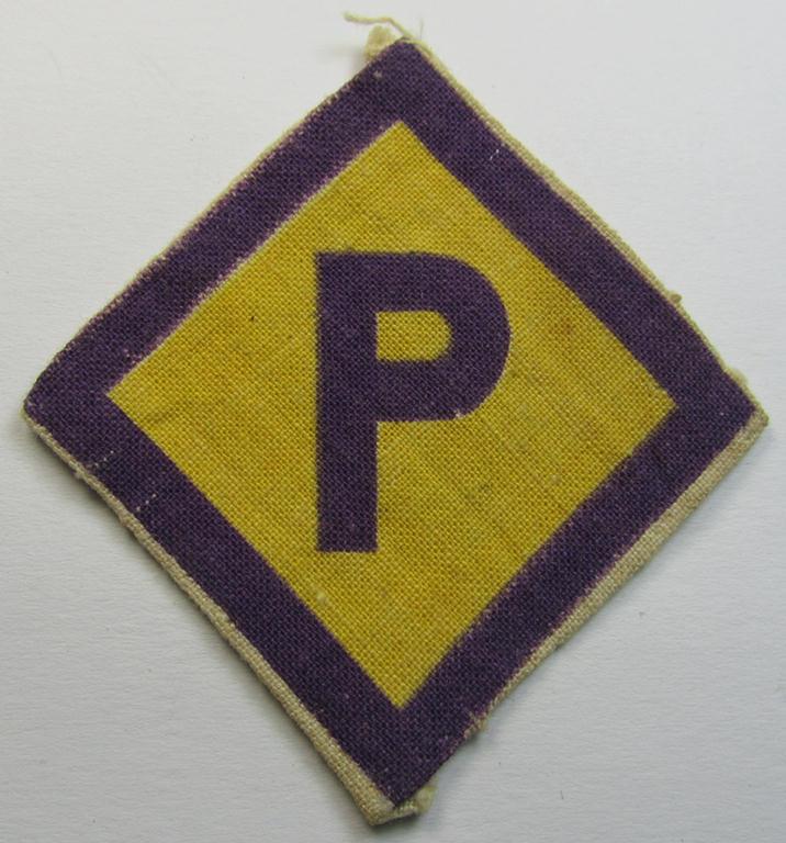 This is a typical 'printed-pattern'-example of a so-called: Polish forced-labour breast-patch (ie. 'Brustabzeichen für Poln. Zwangsarbeiter o. Fremdarbeiter') being a moderately used example that comes in a nicely confectioned ie. carefully pre-folded, condition. The golden-yellow-toned patch shows a printed capital- and/or purple-coloured 'P'-character and equally purple-coloured rim. These patches were worn by the various Polish forced-labour-staff that worked in the war-industry all over Europe. The patch - that shows some moderate age ie. staining - is executed in the typical 'printed'-pattern and was (presumably) used ie. tunic-removed. I deem that I did price this interesting breast-patch accordingly!