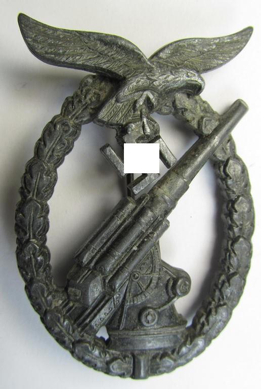 Later-war period- and/or: zinc- (ie. 'Feinzink'-) based- example of a maker- (ie. 'WH'-) marked, WH (Luftwaffe) 'Flakkampfabzeichen' (or: airforce anti-aircraft badge), as was produced by the desirable: 'Wilhelm Hobacher'-company