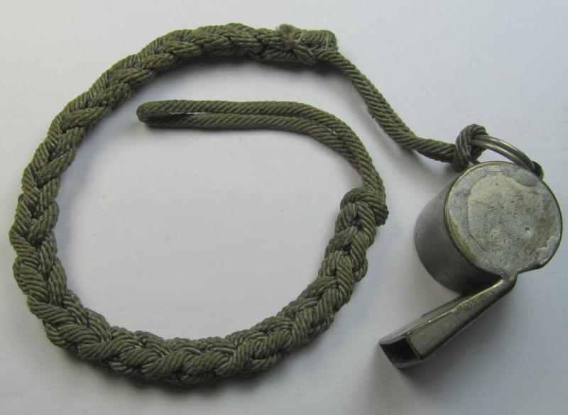 This is a neat - and not that commonly encountered! - WH (Heeres, Kriegsmarine etc.) personal-equipment-item: a genuine period, silvered-copper-based flute (ie. 'Flöte') that comes mounted onto its original (greyish-coloured- and twisted) lanyard and that comes as issued and/or recently found. These flutes were 'standard'-equipment items for all WH-non-commissioned-staff (ie. NCOs) and were used during exercises, training as well as during battle at the front. The lanyard - and flute - show some moderate wear and usage but nothing too shocking. Simply a neat WH personal-equipment-item that comes in a nicely preserved condition and that is accordingly priced!