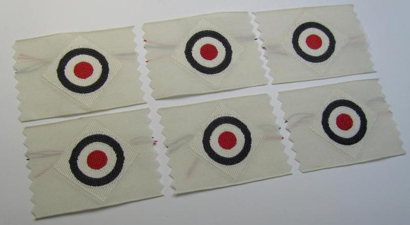 I recently uncovered six - fully identical and actually truly scarcely found! - examples of the WH (Kriegsmarine) cap-cocarde as executed in 'BeVo'-weave pattern on a white-coloured background as was exclusively produced for usage on the white-coloured naval side-caps (ie. 'Schiffchenmützen') and that come all six in a truly unconfectioned- (ie. 'virtually mint- ie. unissued'- and/or never cap-attached-), condition. The cocardes - which come as 'straightly cut-off the role' - do show some minimal staining caused by decades of storage only and are executed on a typical white-coloured- (and/or linnen-based) background as to be expected. It should be noted that these KM-related cap-cocardes are very hard to find something that merits my asking-price. My asking price is naturally intended per single specimen. Simply a nice occasion to acquire a truly rarely encountered piece of naval-related cap-insignia!