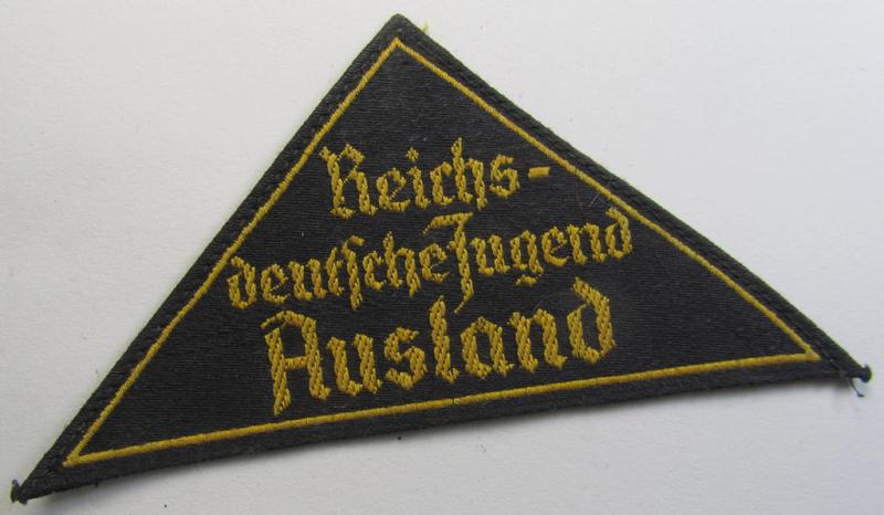 Superb - and extremely rarely encountered! - 'HJ' ('Hitlerjugend') district-triangle (ie. 'Gebietsdreieck') entitled: 'Reichs-deutsche Jugend Ausland' being an (I deem) worn- ie. used specimen that misses its 'RzM'-etiket