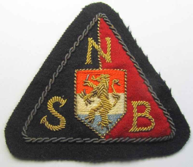 Superb - and presumably Dutch-produced - example of an (I deem) early-pattern and neatly machine-woven NSB- (or: 'Nationaal Socialistische Beweging'-) related- and hand-embroidered arm-patch as was intended for usage on the black-coloured attire