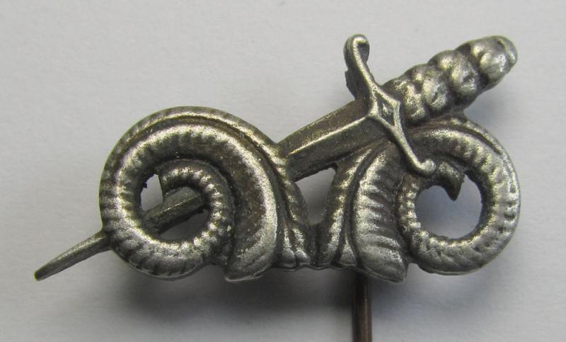 This is a neat - and with certainty rarely seen! - silverish-toned- and/or typical 'Buntmetall'-based! - Dutch facist-party-related membership-badge (or in Dutch language: 'Ledendraagteken') as was specifically intended for members serving within the party named: 'Zwart ie. Nationaal Front' (being a nicely preserved and non-maker-marked example) that comes in an overall nice (albeit moderarely used- and/or worn-), condition. The smaller-sized lapel-pin - having an approximate width of only 2,8 cms. and featuring a sword between a pair of ram-horns - is a non-maker-marked example that comes mounted onto its original (and/or long-sized) pin. The 'Zwart Front' (which can be translated as Black Front) was a Dutch greater Netherlandic and fascist-movement active before and during the Second World War. The 'Zwart Front' grew out of the southern section of the General Dutch Fascist League, with regional organiser Arnold Meijer quarrelling with leader Jan Baars and leading his followers out in 1934. The 'Zwart Front' emerged and soon took over a number of smaller movements, while also gaining some support among the poorer parts of society. Although similar to its parent movement, the 'Zwart Front' emphasised a more Catholic line in tune with Meijer's own religious beliefs. Taking its cue in part from Italian fascism, it adopted that movement's black-shirted uniform while adding a unique emblem featuring a sword between a pair of ram-horns. However, the group struggled to gain support from the National Socialist movement in the Netherlands (ie. the NSB); it was renamed: 'Nationaal Front' in 1940. The 'Nationaal Front' was ultimately banned by the Germans on 14 December 1941, along with all other Dutch political parties except for the NSB. The majority of its members switched to the NSB, although Meijer, disillusioned, left politics altogether. The piece on offer here shows a fully undamaged surface (the pin has I deem never been cleaned nor polished). This badge originates from an older Dutch collector who collected these for various decades. Simply a very nice example of this scarcely encountered 'Zwart ie. Nationaal Front'-related membership-badge: hard to find a nicer and more reasonably priced example!