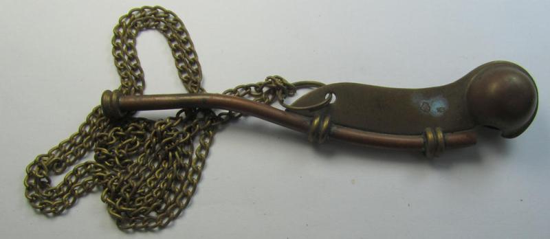 Neat, WH (Kriegsmarine) personal-equipment-item: a golden-bronze-coloured- and (I deem) copper based flute (ie. 'Bootsmanns-Flöte') that comes mounted onto its original also copper-based 'chain'