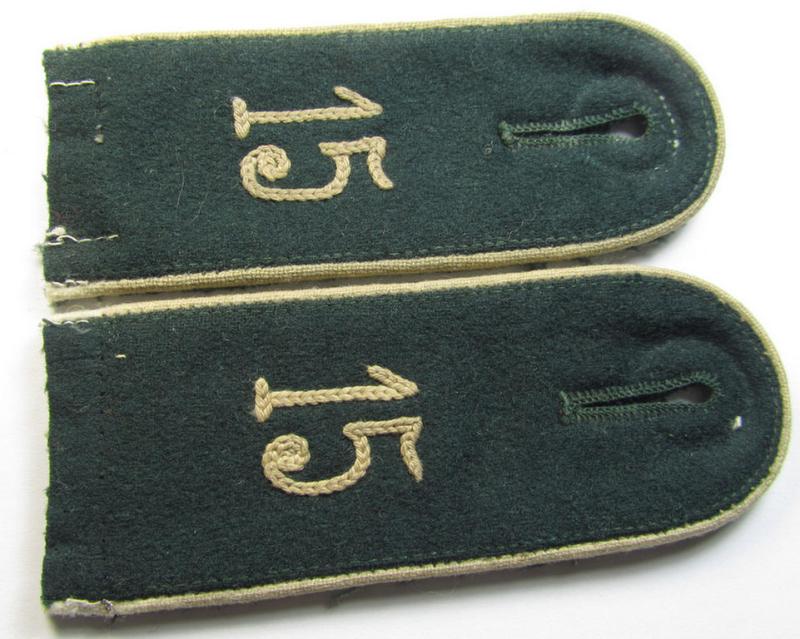 This is a very attractive - fully matching and (I deem) quite early-war- ie. evt. pre-war-period! - pair of 'standard-issued'- (ie. 'non-privately-purchased'-) pattern, WH (Heeres) early- ie. pre-war period- (ie. 'M36'- (ie. 'M40'-) pattern and/or: rounded-styled), neatly 'cyphered' enlisted-mens'-type shoulderstraps (ie. 'Schulterstücke für Mannschaften des Heeres') as was piped in the desirable white- (ie. 'weisser'-) coloured branchcolour as was specifically intended for usage by a: 'Soldat des Infanterie-Regiments 15' (or: simple soldier who served within the 15th infantry regiment) and that comes in an overall nice- (ie. just moderately used- ie. worn-), condition. The neat straps - which have the 'standard'-pattern, darker-green-coloured and/or typical 'smooth woolen'-based 'upperdecks' and that measure approximately 11,2 cms. in length each - show the neat white- (ie. 'weisser'-) coloured and/or (typical) woolen-type piping attached (as can be seen on the pictures). They never had any tongues attached and where as such intended as a pair of the 'sew-in'-pattern: they come both in a very nice- (ie. fully 'text-book') condition overall (as can be seen on the pictures). The straps show the neat (machine-embroidered by means of so-called: 'Kurbelstickerei'-): '1'- and/or '5'-cyphers (ie. numerals or 'Ziffern') attached which are executed in the white- (ie. 'weisser'-) coloured wool ie. linnen as to be expected (as can be seen on the pictures). The pair only shows moderate wear and/or age and is just nicely preserved over the years (as can be seen on the pictures). I deem this an excellent occasion to acquire a neat EM-type, 'Infanterie'-related Heeres-shoulderstrap-pair for a justified price!