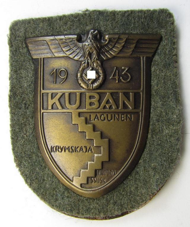 Very attractive - and actually scarcely encountered! - WH (Heeres ie. Waffen-SS) 'Kuban'-campaign-shield that comes mounted onto its original field-grey-coloured- and/or woolen-based 'backing'