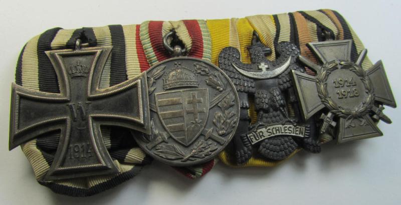Attractive, 4-pieced medal-bar (ie. 'Ordenspange') respectively depicting a WWI-period: 'EK II. Klasse', an: Austrian/Hungarian WWI commemorative medal, a: 'Schlesisches Bewährungsabz. der II. Kl.' and a: 'FKK 1914-18 m. Schw.'