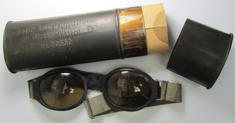 Superb - and/or fully undamaged! - example of a WH (Luftwaffe) pilots'-flight-goggles (ie.: 'Flieger-Splitterschutzbrillen mit Ultrasin-Gläsern “D” - Fl 30550' that comes stored in its period, metal-based etui (ie. container)