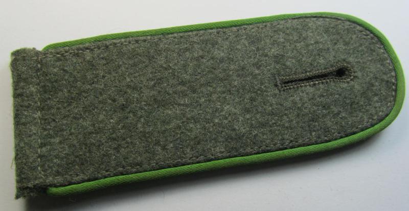 This is a truly very attractive - albeit single but nevertheless fairly scarcely encountered! - WH (Heeres) (I deem) mid-war period- (ie. 'M43'-pattern) enlisted-mens'-type-shoulderstrap as was piped in the desirable bright-green- (ie. 'wiesengrüner'-) coloured branchcolour as was intended for - and most certainly worn by! - a: 'Soldat der Panzer-Grenadier-Truppen' (ie. simple soldier who served within an infantry-related, so-called: rifle-regiment ie. unit) and that comes in an overall very nice (albeit moderately used- ie. worn-), condition. The neat shoulderstrap - which measures 12 cms. sized in length - has the field-grey-coloured- and/or woolen-based 'upperdeck' and has the neat (and desirable!) bright-green- (ie. 'wiesengrüner'-) coloured- and/or 'silk-like'-type, piping, attached. The strap comes naturally mounted onto its functional tongue and does show just some minimal wear, usage and/or age. Simply a very attractive - and scarcely found! - EM-type 'Panzergrenadiere'-shoulderstrap that belonged to a: 'Soldat der Panzer-Grenadier-Truppen': too bad that it is only a single specimen!