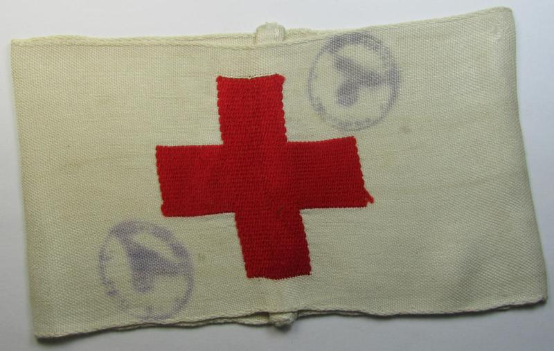 Attractive, WH (Heeres) related-, linnen-based- and/or neatly 'machine-embroidered', beige-white-coloured DRK- (ie. 'Deutsches Rotes Kreuz'-) armband (ie. 'Armbinde') as was intended for a staff-member serving as a medical orderly