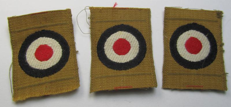 This is a very desirable and actually truly rarely encountered replacement-piece: a WH (Heeres) 'tropical-issued' cocarde (ie. 'Mützenkokarde') of the desirable first-pattern as was used on the tropical side- (and/or 'M41'-type) caps (ie. 'Schiffchen o. Feldmützen') as was executed in neat 'BeVo'-weave pattern on a light-yellowish-brown (ie. tan-) coloured background and that comes in a wonderful- (ie. never used- ie. 'virtually mint- ie. unissued'-), condition. I found three identical pieces that came just 'cut-of the role' (as can be noticed on the pictures). The cocardes just show some minimal age and/or slight staining (as can be seen on the pictures). It should be mentioned that these tropical cocardes (of the first pattern) as executed in the 'BeVo'-weave pattern rank amongst the most difficult to obtain cocardes of the period. My asking-price is naturally intended for a single specimen. Simply one of those insignia-pieces that are almost impossible to find if needed!