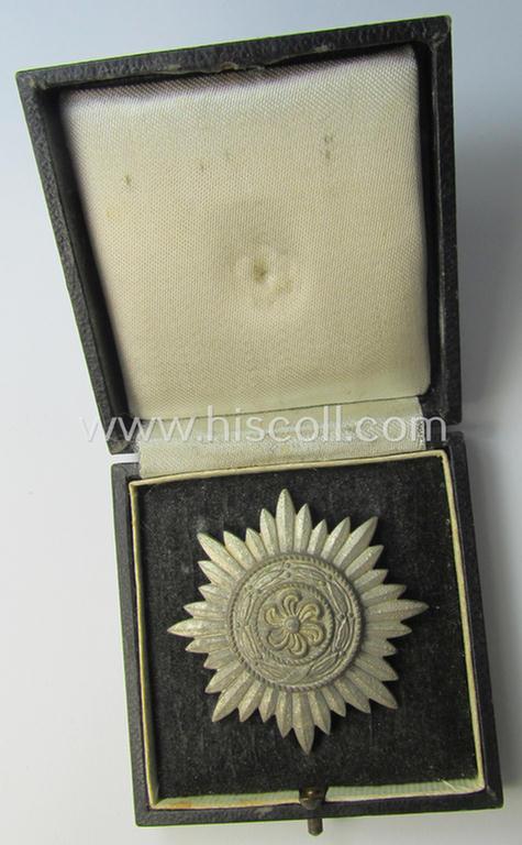This is an attractive - just moderately used and actually fairly scarcely encountered! - WH-related, so-called: 'Verdienstauszeichnung o. Steckkreuz für Angehörige der Ostvölker, 1. Klasse in Silber ohne Schwertern' (or: silver-class 'Ostvölker' merit-medal ie. breast-star for merit on the Eastern Front being of the second-class-pattern without swords) being a neatly maker- (ie. '100'- thus by the 'Hersteller': 'Rudolf Wächtler & Lange'-) marked- and/or: silvered 'Feinzink'-based example that comes stored in its period-etui as issued and/or recently found. The neat award comes in an overall very nice- (I deem only minimally used ie. worn-) condition and retains most of its (fairly glossy) silver-toned finish and still retains great pronounced detail (it is just a tiny bit tarnished- ie. dirty as to be expected but was never cleaned nor polished: it comes naturally mounted onto its functional (and unaltered) pin- and/or pin-catch set-up as can be seen on the pictures). The etui comes in a nicely preserved - albeit clearly used! - condition: it is fully functional and is nicely preserved (as can be seen on the pictures). The faily luxuriously-styled etui (that shows the typical 'square-sized corners' as more often) has a fully preserved, black-coloured (ie. simulated velvet) interior-section that shows a clear imprint of the badge it once held (as can be seen on the pictures). The etuis'-top shows a (fully preserved and silver-toned) illustration of the badge (as can be seen on the pictures). The etui was I deem just moderately used and does show some obvious age, wear and/or staining. Simply a attractive - and desirable! - WH-related, so-called: 'Verdienstauszeichnung o. Steckkreuz für Angehörige der Ostvölker, 1. Klasse in Silber ohne Schwertern' that is accordingly priced!