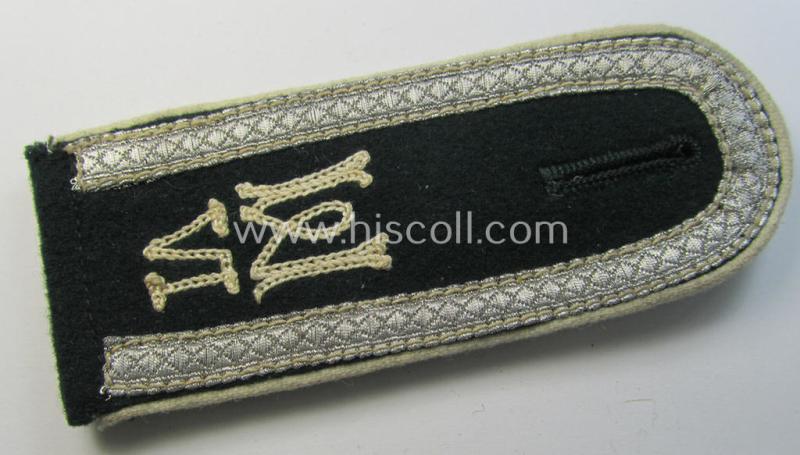 This is a truly very attractive - albeit regrettably single albeit nevertheless scarcely encountered! - pre- (ie. early-war-) period- (ie. 'M36/M40'-pattern) 'cyphered' and rounded-styled, WH (Heeres) NCO-type shoulderstrap as piped in the neat white- (ie. 'weisser'-) coloured branchcolour as was specifically intended for usage by an: 'Unteroffizier der Infanterie-Truppen u. Mitglied des Wehrkreis-Kommandos 6' (or: junior-sergeant and infantry-soldier who served within the region ie. 'Wehrkreis', numbered: '6') and that comes in an overall very nice- (albeit moderately used ie. worn-), condition. The neat strap - which is of the pre- (ie. early-) war-period type - has the darker-green-coloured and/or woolen-based 'upperdeck' and does show as stated above the white- (ie. 'weisser'-) coloured branchcolour and/or woolen-type piping attached. The shoulderstrap shows the (typical) silver-toned NCO-braid attached and comes mounted onto its functional tongue attached (it measures approximately 11,5 cms. in length as more often). It does show the neatly machine-embroidered, so-called: Latin-styled 'W'-cypher (ie. 'Ziffer') and/or: Roman-styled 'VI'-numeral (which are both executed in white-coloured machine-stitching ie. so-called: 'Kurbelstickerei') denoting that it was a strap that was used by an: 'Unteroffizier' (ie. I deem recruiting-official) who was attached to the: 'Wehrkreis-Kommando', numbered: '6'. The strap shows some minimal age, wear and or minimal staining (as can be seen on the pictures). It should noted that these neatly 'cyphered' 'Wehrkreis-Kommando'-related shoulderstraps can easily be graded 'rare': too bad that it is only a single specimen!