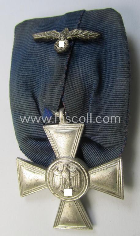 This is a truly very attractive - and I deem just moderately used- and/or worn! - example of a (bright!) silver-toned WH (Heeres o. Kriegsmarine) so-called: 'Einzelspange' or: single-pieced medal-bar (being of the non-detachable-pattern) showing a detailed: 'WH-Dienstauszeichnung 2. Stufe' (as was intended for 18 years of loyal-service) and that has a neat and pronounced (regular-sized) WH (Heeres o. Kriegsmarine) eagle-device period-attached and that comes mounted onto its confectioned, darker-blue- (ie. cornflower-blue-) coloured ribbon (ie. plate) as issued. The detail on this example is simply extraordinary: it has - I deem - never been cleaned nor polished and has a very attractive and just minimally tarnished) age-patina. The medal is 'mounted' onto a clasp (with functional pin/catch-set-up) as was intended for wearing this example on a 'going-out'- ie. dress-tunic or 'Waffenrock'. This example truly retains gorgeous details and has a great age-patina: it retains all of its somewhat 'frosted'- and/or: silver-toned finish without showing any defaults. The piece is nicely 'backed' with a piece of field-grey-coloured wool as is more often seen (as can be seen on the pictures). The darker-blue-coloured ribbon shows only minimal usage and/or staining. Simply a very attractive WH (Heeres o. Kriegsmarine) example of a higher-class 'WH-Dienstauszeichnung' that comes mounted as an: 'Einzelspange'!