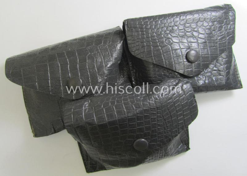 I recently found three - fully complete and 'standard'-issue! - pairs of WH sun- (ie. protective-) glasses (or: 'Schützbrille') (of the make ie. type: 'Zeiss- Umbral') that came all stored in their period, unusual grey-coloured- and/or 'plastic-like'-based (ie. 'Ersatz'-type) etui and that come all three in a 'virtually mint- ie. unissued'- and/or simply never worn- nor used, condition. The pairs - which are all three constructed from greyish-coloured, genuine leather - come with their fully undamaged (brown-coloured) glasses in place and still hold their period-attached and fully elastic carrying-straps (ie. 'Haltebänder'). The pairs came stored in their period, unusual grey-coloured- and/or 'plastic-like'-based etui (that all have a functional (by 'Prym'- marked) 'snap' in place as can be seen on the pictures. Of additional interest is, moreover, the fact that these specimen came with their period instruction-leaflets. These neat service-glasses saw widespread-usage througout the war and numerous pictures exist wherein this type of equipment is seen being worn. All three sets show some minimal storage-age only (but are fully functional and totally undamaged). My asking-price is naturally per single set/pair. Simply a nice occasion to acquire a neat - and fully complete! - 'Wehrmacht'-equipment-item that is not that often offered for sale in this 'virtually mint- ie. unissued'-condition!