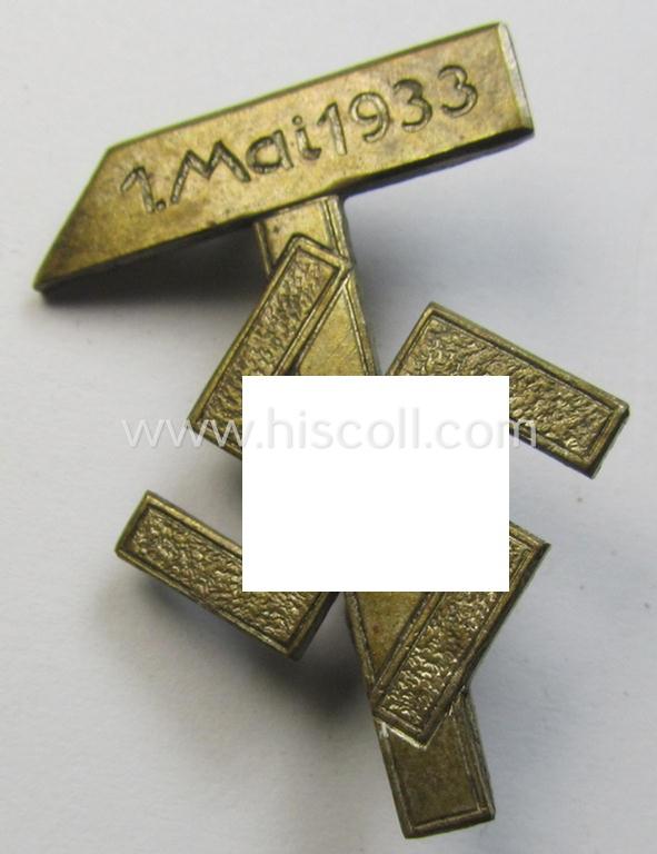 Attractive - and scarcely encountered! - commemorative lapel-pin (ie. 'Veranstaltungsabzeichen') being a non-marked example as executed in silverish-golden-toned 'Buntmetall' depicting a hammer-/swastika-device coupled with the text: '1. Mai 193...