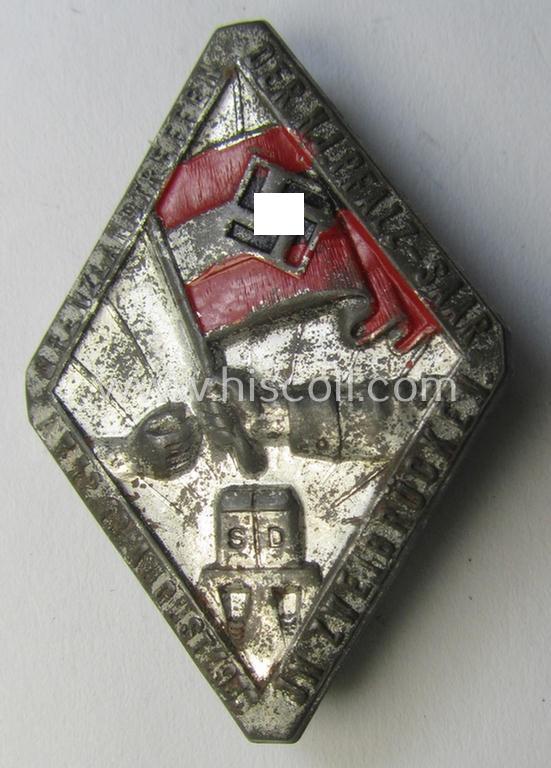 The attractive - scarcely found and unusually square-sized in the format of a 'HJ-Raute'! - day-badge (ie. 'tinnie' or: 'Veranstaltungsabzeichen') is executed in greyish-silver-coloured- and zinc- (ie. 'Feinzink-) based (pot)metal: it shows some normal wear and/or moderate age. The badge comes mounted onto a functional pin-/catch set-up and has (I deem) never been cleaned nor polished: it shows some age ie. staining (as can be seen on the pictures). The 'tinnie' is still quite detailed and retains a fair bit of its somewhat darkened- and/or: tarnished, silver-coloured finish. The 'tinnie' shows (as stated above) a clearly present, period-glued-on makers'-designation-label (that reads: 'F. Mannheim - Kaiserslaurttern' as can be seen on the pictures). The piece shows two hands holding a coloured (ie. painted) 'HJ-Fahne' and is surrounded by the text: 'Grenzlandtreffen der HJ Pfalz-Saar am 12./13. August 1936'. Simply an attractive - and unusual and surely not that easily found! - 'HJ'- (ie. 'Hitlerjugend'-) sports-related 'tinnie' that is accordingly priced!