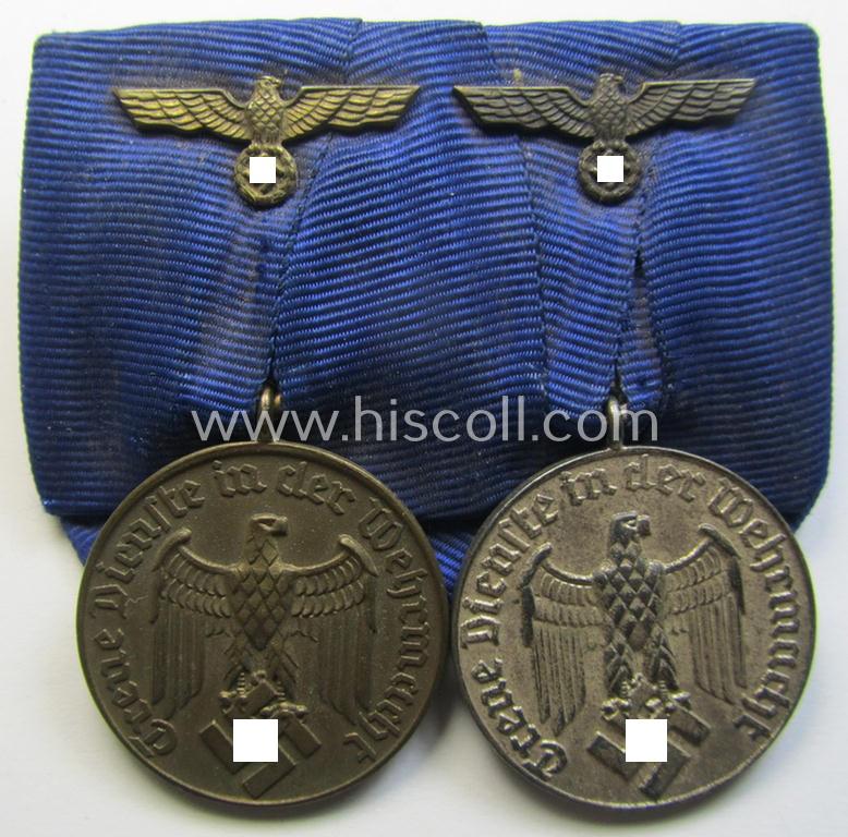 Attractive, two-pieced medal-bar (ie. 'Spange') showing two: WH (Heeres o. Kriegsmarine) so-called: 'Dienstauszeichnungen für 4 u. 12 Jahre Treue Dienste' that both come period-mounted as a so-called: 'Doppelspange'