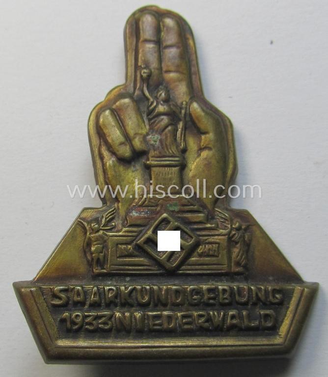Attractive - and unusually found! - early-period, N.S.D.A.P.-related 'tinnie' (ie. 'Tagungs- o. Veranstaltungsabzeichen') that is showing the text: 'Saarkundgebung - 1933 - Niederwald'