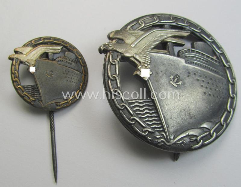 The attractive - and truly quality-produced! - WH (Kriegsmarine) award-set holds both the regular- and/or half-sized version of the: 'Blockadebrecher-Kriegsabzeichen' (or: blocade-runner war-badge). Both pieces are (I deem) only minimally worn and were always kept as a set (they originated from a German private-household where they were recently found together: they were never part of any collection). Both attractive 'Kriegsmarine'-related awards retain great pronounced detail and retain most of their 'off-factory' bluish-coloured- ie. bright-silverish finish (as can be seen on the pictures): the neat set has (I deem) never been cleaned nor polished (but was, nevertheless, moderately worn). The regular-sized badge (which is of the typical 'Buntmetall'-based-, 'flat-back'-pattern-) shows a clearly present makers'-marking (that reads: 'Fec. Otto Placzek Berlin - Ausf. Schwerin - Berlin') whereas the neat and/or: 26 mm.-sized: 'Halbminiatur' is void of any makers'-signification (as is more often the case). The regular-sized award comes naturally mounted onto its (fully functional) pin- and/or pin-catch set-up whereas the miniature is mounted on its full-sized pin as to be expected. It should be noted that these (matching!) quality-produced- and/or: 'Buntmetall'-based 'Blockadebrecher-Kriegsabzeichen'-sets can easily be graded 'scarce' and are not that often offered for sale: I deem that I have priced this great and fully untouched set accordingly!