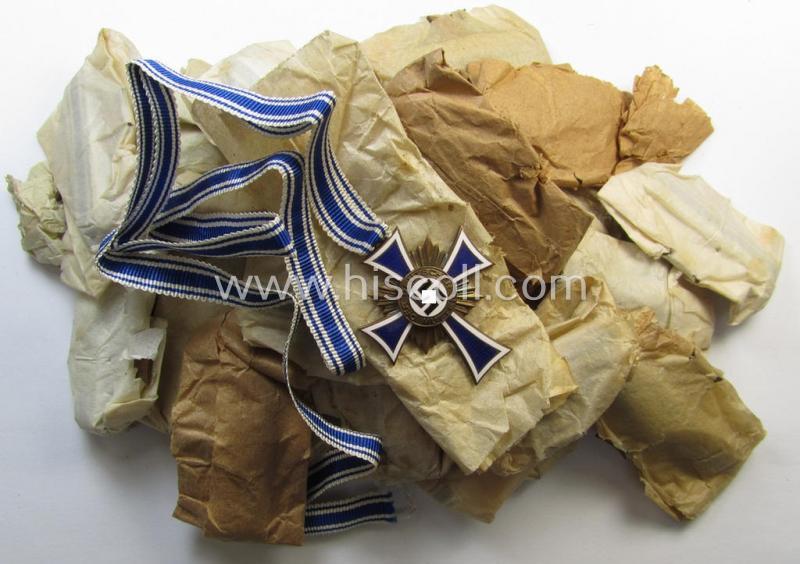 I recently uncovered a quantity of 20 (!) - fully identical and truly very nicely preserved! - specimen of the German WWII-period, so-called: 'Ehrenkreuz der Deutschen Mutter - Dritte Stufe' (or: bronze-class mothers'-crosses) all examples coming in an overall very nice- (ie. truly 'stonemint- ie. unissued'!), condition. The awards are - as stated above - very attractive and enamelled specimen that come all mounted onto their (long-sized- ie. approximately 60 cms. long-sized) ribbon and that were simply never used nor issued. The awards have a fully preserved bronze-toned age-patina and have of course a pristine (ie. fully undamaged), enamelled surface. Some minimal age, dust ie. staining is, however, visible and/or present, simply caused by decades of storage only. The pieces have most certainly never been cleaned nor polished and therefore are details and/or finish still very nice and/or crisp. They come all still packed in their period piece of thin-shaped and/or white- ie. brownish- coloured 'wrapping-paper' as delivered by the producing-company: they were never unpacked and come as found with the long-sized ribbon still 'wrapped-around' them (as can be seen on the pictures). My asking-price is naturally intended for a single cross. Pls. do note that the item will not show 'reserved' when ordered: this is just the case when the last example has been reserved. Simply a nice occasion to acquire a truly 'minty' example of an: 'Ehrenkreuz der Deutschen Mutter - Dritte Stufe' for a very competitive price!