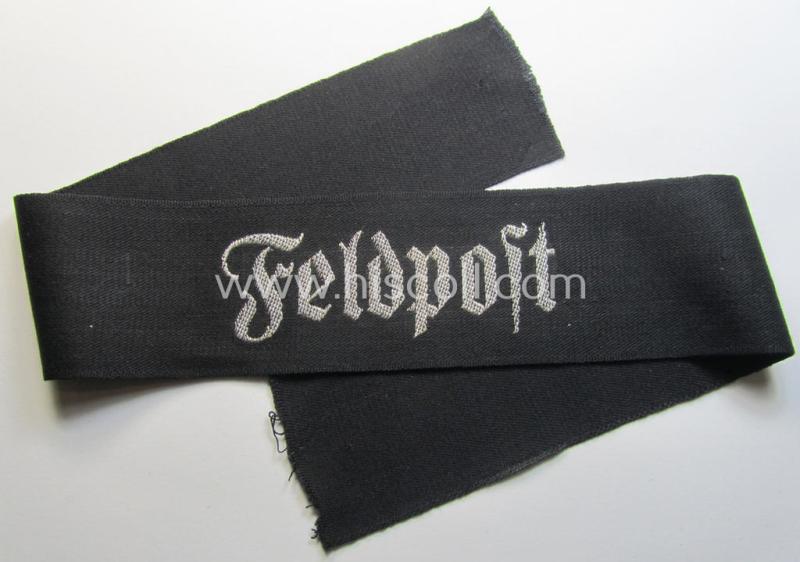 Superb - and most certainly rarely seen! - WH (Heeres) related cuff-title (ie. 'Ärmelstreifen für Führer') being a typical black-coloured- and linnen-based example showing the (neatly silver-toned- and 'flatwire'-woven!) text that reads: 'Feldpo...