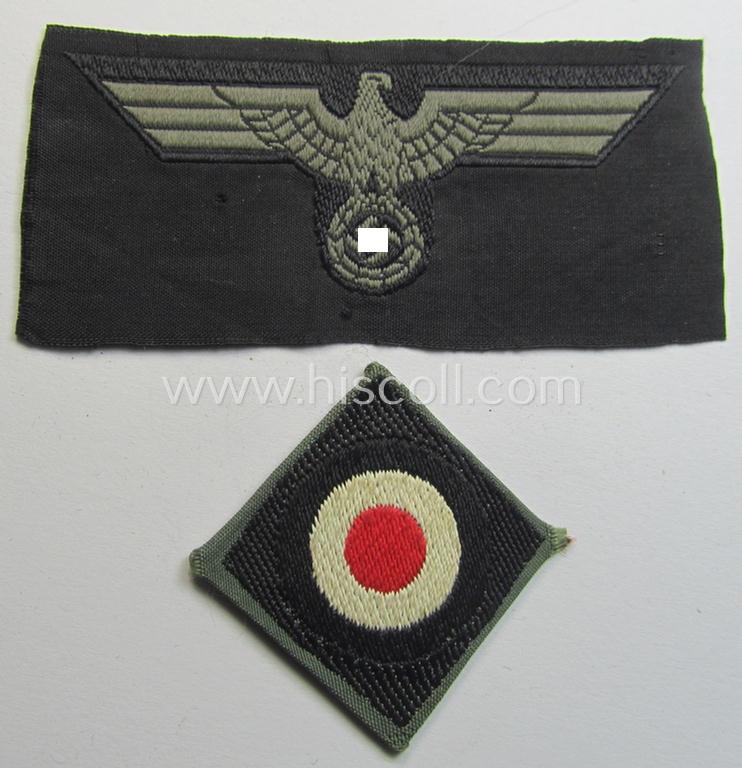 Superb, later- (ie. mid-) war-period, WH (Heeres) 'Panzer' side-cap- (ie. 'Schiffchen') eagle and dito cocarde both pieces as executed in greyish-blue-coloured linnen onto a black-coloured (and also linnen-based) background