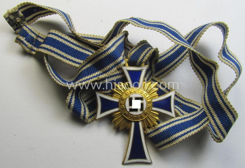 Attractive, 'Ehrenkreuz der deutschen Mutter - erste Stufe' (or: golden-class mothers'-cross) being a hardly used example that comes mounted onto its accompanying, long-sized ribbon as issued and/or recently found