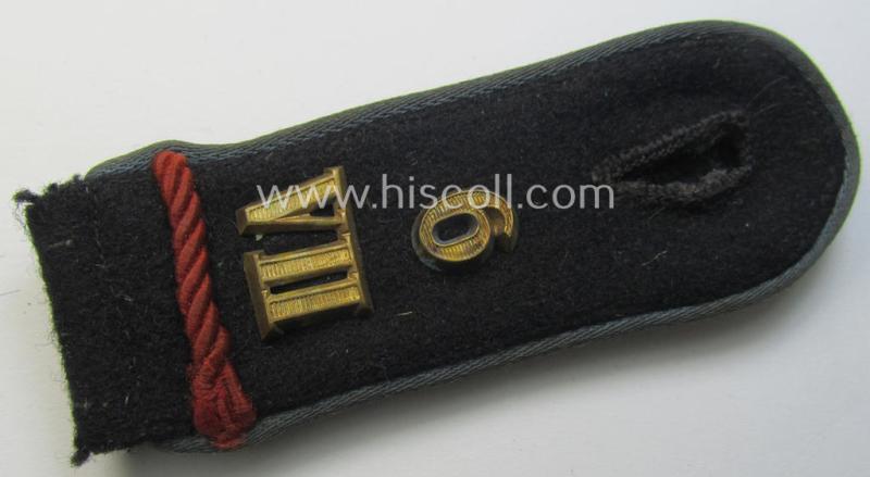 This is an attractive - albeit regrettably single, unusally 'cyphered' and just moderately used- and/or worn! - WH (Luftwaffe- ie. Hitlerjugend-) related, so-called: 'Flakhelfer'-shoulderstrap as piped in the (typical) bright-blue- (ie. 'kornblumenblauer'-) coloured branchcolour as was intended for usage by a: 'Flakhelfer' (ie. later-war-period, youthfull anti-aircraft staff-member) and that comes in an overall nice- (ie. just moderately used- and/or worn-), condition. The strap measures approximately 10 cms. in length (as more often) and has the black-coloured- and typical smooth-woolen-based 'upperdeck' (and has the 'silk-like'-type- and/or blue-coloured piping attached). The strap just shows some moderate wear and comes in an overall very nice- and/or fully undamaged, condition. The strap - that shows some moderate age and wear - shows the 'Luftwaffe'-type, bluish-grey-coloured- and/or woolen-based 'backing' and came mounted onto its (smaller-shaped) tongue: moreover, does it also show a single (horizontally-mounted) bright-red-coloured, rank-'slip-on' (ie. 'Lasche') and golden-toned 'cyphers' '6'- and/or 'VII'-cyphers period-attached (as can be seen on the pictures). The strap came from a German private-household and was never before in collectors'-hands. Simply an attractive, later-war period- and youth-related 'Flakhelfer'-shoulderstrap that is actually not that often offered for sale: too bad that it is only a single specimen!