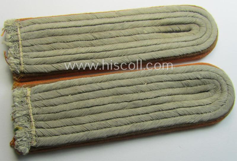 This is an attractive - fully matching and I deem never used- nor worn! - pair of TR-period so-called: 'Gendarmerie o. Schutzpolizei'-related, officers'-pattern shoulderboards (ie.: 'Schulterstücke für Offiziere der Gendarmerie o. Schutzpolizei') and that comes in an overall very nice- (ie. I deem never used- nor tunic-attached- ie. 'virtually mint'-), condition. The boards never had any pips nor numerals attached and were as such intended for a junior-officer holding the rank of: 'Leutnant' (ie. lieutnant). The boards constructed from bright-orange- (ie. 'orangeroter'-) linnen and have the silver-toned 'upperdecks', typical rust-brown-coloured (and/or woolen-based) branchcolour (ie. 'Zwischenfarbe') and simply show no wear (as can be seen on the pictures). The boards are just a bit 'tarnished' and dusty caused by normal age and/or storage for decades (as can be seen on the pictures). This particular shoulderboard-pair originates from a smaller cloth-insignia-collection that I recently acquired. Simply an attractive pair of 'Gendarmerie o. Schutzpolizei'-related shoulderboards: I deem that I have priced this attractive pair accordingly!