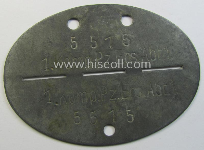 Superb - and scarcely found! - typical zinc-based, WH (Heeres-) ie. 'Panzer'-related ID-disc (ie. 'Erkennungsmarke') bearing the clearly stamped unit-designation that reads: '1.Komp.Pz.Ers.Abt.1' and that comes as issued and/or worn