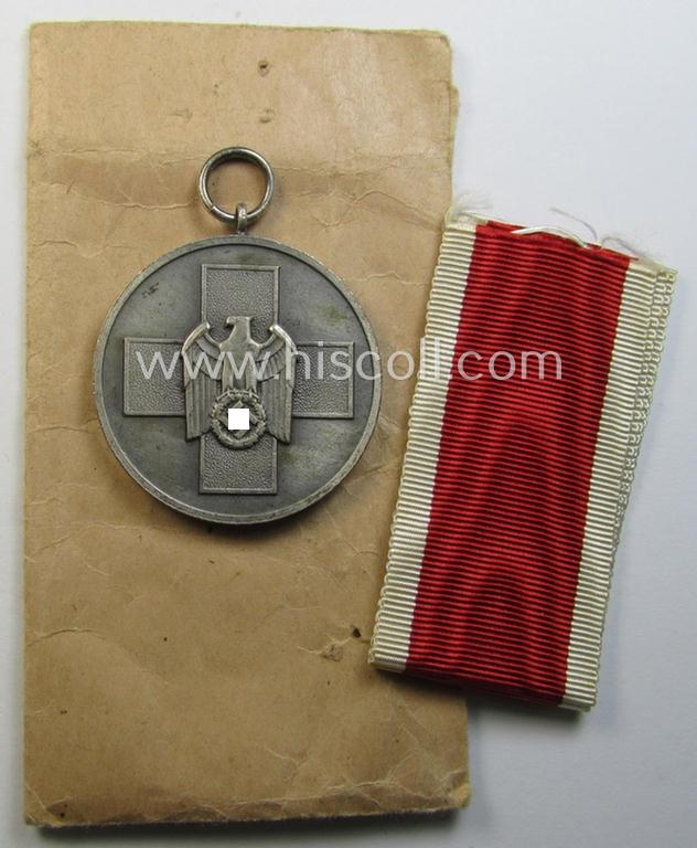 This is an attractive medal-set: 'Medaille für Deutsche Volkspflege' (or: civil-service medal) being a (typical) non-maker-marked specimen that comes packed in its original pouch of issue by the: 'E. Ferd. Wiedmann'-company as issued and/or recently found and that comes in an overall very nice- (and/or simply never worn- nor mounted-), condition. The medal came together with its original, non-confectioned- (and approx. 24 cms. long-sized- and bright-red-coloured- and nearly pre-folded) ribbon (ie. 'Bandabschnitt') and came packed in its neat ('Zellstoff'-based- and/or: beige-brown-coloured) carton pouch. The medal - which is an attractive zinc- (ie. 'Feinzink'-) based specimen - was I deem most certainly issued but never used. The medal has a quite 'shiny' age-patina and was most certainly never cleaned nor polished and therefore are details and/or finish still very nice and/or crisp. The pouch comes in an equally nice and complete condition: it is fully functional and does show the printed makers'-designation of the medal-producing company named: 'E. Ferd. Wiedmann' as based in the town of Frankfurt am Main (as is printed on its back as stated above). Simply a nicely preserved 'Medaille für Deutsche Volkspflege'-set that is with certainty accordingly priced!