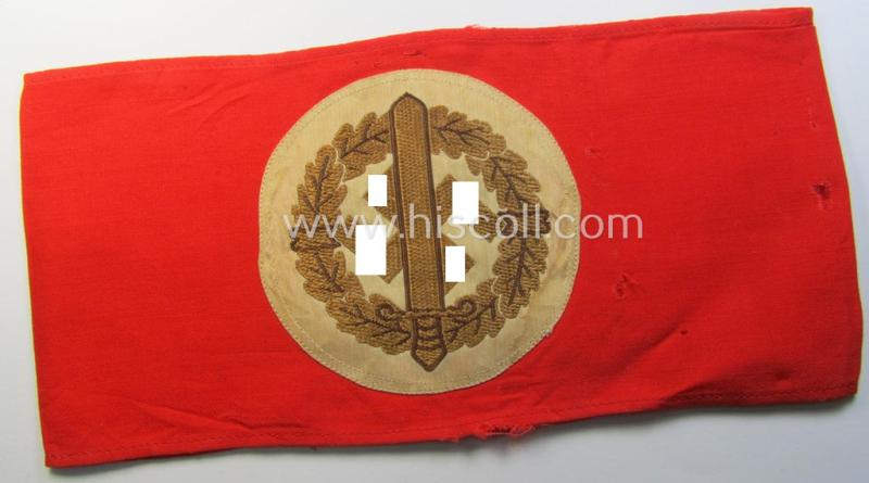 This is an attractive - and clearly worn but still nicely preserved! - example of a bright-red-coloured- and/or typical linnen-based armband (ie. 'Armbinde') as was intended for usage by the: 'SA-Wehrmannschaften' being a moderately used- ie. slightly worn example that still shows its period-attached- and/or paper-based, so-called: 'RzM'-etiket and that comes in an overall very nice- (and I deem moderately worn- ie. used-), condition. These decorative armbands - having a neat 'BeVo'-woven 'centered' roundel attached - were intended for specific wear on the civilian-attire but also do pictures exist were these armbands are worn on the specifically-styled- and/or brown-coloured uniforms of men attached to the so-called: 'SA-Wehrmannschaften'. The bright-red-coloured armband (as executed in bright-red coloured linnen) shows as stated above a seperately attached white-coloured 'center-piece' (depicting a golden-bronze-coloured 'SA Sportabzeichen') period-'sewn-on'. The piece on offer here - which was off-factory sewn-together - measures approx. 45 cms. by 11,5 cms. and does show some minimal age and/or tiny holes (as can be seen on the pictures). Simply a very attractive 'SA-Wehrmannschaften'-armband that is just moderately used!