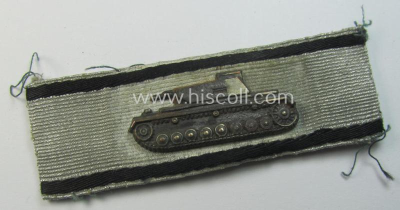 This is a neat - truly worn- and/or clearly damaged- ie. rust-stained! - so-called: 'Sonderabzeichen für das Niederkämpfen von Panzerkampfwagen usw. durch Einzelkämpfer in Silber' (ie. tank-destruction badge ie. TDB in silver) on offer here is a clearly used (albeit genuine!) example showing a regrettably rust-damaged (but magnetic!) tank-badge mounted onto its original piece of nicely 'inter-woven', silver- ie. black-woven cloth ie. braid and that comes in a still collectible albeit relic, condition. The piece still retains its original (three) unaltered and functional prongs and/or metal- (ie. zinc-) based back-plate but is void of its protective 'backing' (as can be seen on the pictures). The piece was most certainly once worn and/or (carefully!) tunic-removed: it still shows some minimal stitching-remains (ie. holes) of having been once tunic-attached. The rust-damaged tank-badge shows some obvious staining but was never cleaned nor polished. I am of course aware of the fact that this is (probably) one of the most copied awards of the TR-period: this is naturally a 100% genuine and truly worn example for which I do give a life-time garuantee (as always). I deem that I have priced this still collectible award accordingly to its desirability and/or unmistaken rarity: a better preserved example would surely fetch almost the double of my asking-price!