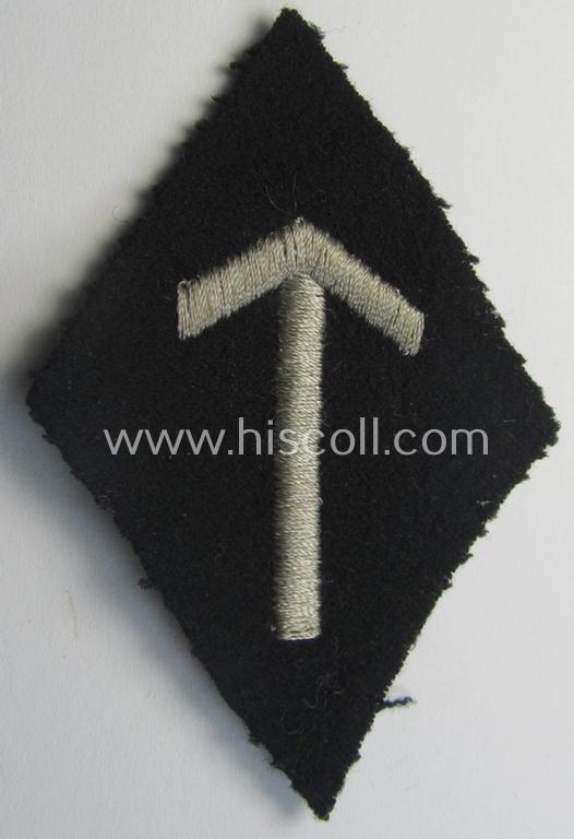 This is a very attractive - and actually very rarely found! - SS-pattern, typically machine-embroidered and/or black-coloured sleeve-insignia (ie. 'Ärmelraute' ie. 'Laufbahn- o. Tätigkeitsabzeichen') depicting depicting a greyish-silver-toned: 'Tyr'-rune-sign as was specifically used to signify assignment to the: 'Ergänzung, Erfassung u. Schulungswesen' (ie. recruitment-, procurement- and education-main-office within the: 'SS') and that comes in an overall very nice- (ie. I deem clearly issued-, moderately worn and/or carefully tunic-removed-), condition. The piece on offer here is a fully 'text-book' example that comes in an overall very nice and fully untouched condition: it is just a tiny bit stained simply caused by moderate wear and/or decades of storage only. It should be noted that this is one of the truly rarely encountered specimen of the extensive series. Simply a nice occasion to acquire a very attractive and 100% original Waffen-SS arm-badge that almost certainly originated from the so-called: 'Dachau'-clothing-depots and that is (I deem) with certainty priced according to its unmistaken rarity and/or desirability!