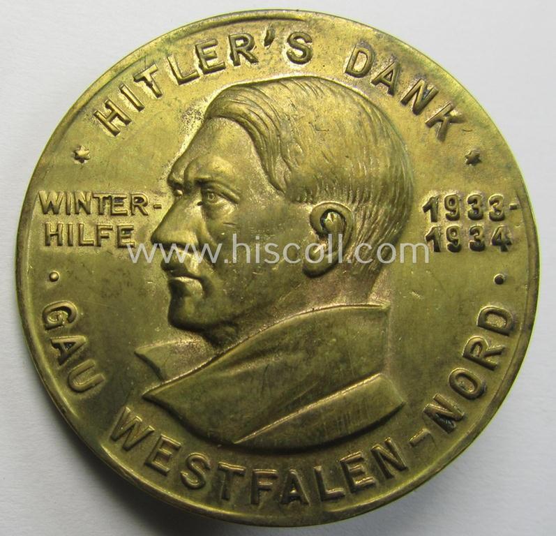 Commemorative, golden 'Buntmetall'-based N.S.D.A.P.- (ie. WHW-) related 'tinnie' being a maker- (ie. 'Paulmann u. Crone'-) marked example depicting Adolf Hitler and showing the text: 'Hitler's Dank - Winterhilfe 1933-1934 - Gau Westfalen-Nord...